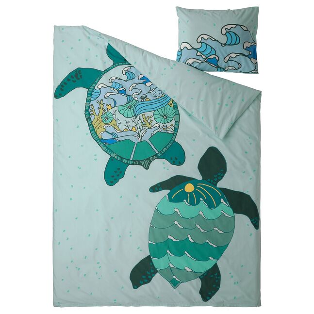 Пенистые гребни волн или счастливые черепахи, плавающие в бирюзово-голубом океане? С этим пододеяльником из хлопка/вискозы с перкалевым плетением вы можете выбрать, какая сторона будет обращена вверх, и менять вид, когда вам захочется.