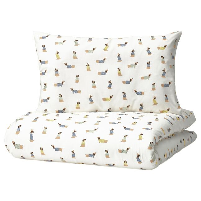 "Мягкие простыни, прохладные и комфортные на ощупь, - хорошее начало для крепкого сна. Хлопок - прекрасный натуральный материал, который дышит, когда малышу становится тепло". Серия DRÖMSLOTT с милыми щенками в нейтральных цветах способствует созданию спокойной атмосферы в постели. Многие малыши также чувствуют себя в безопасности, когда рядом с ними в постели находится мягкая игрушка. "Прикосновение к чему-то знакомому может помочь им успокоиться и заснуть".