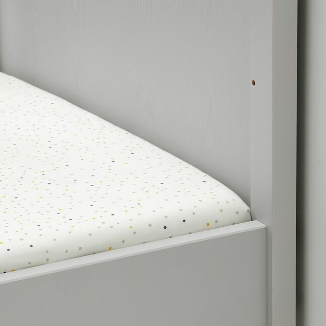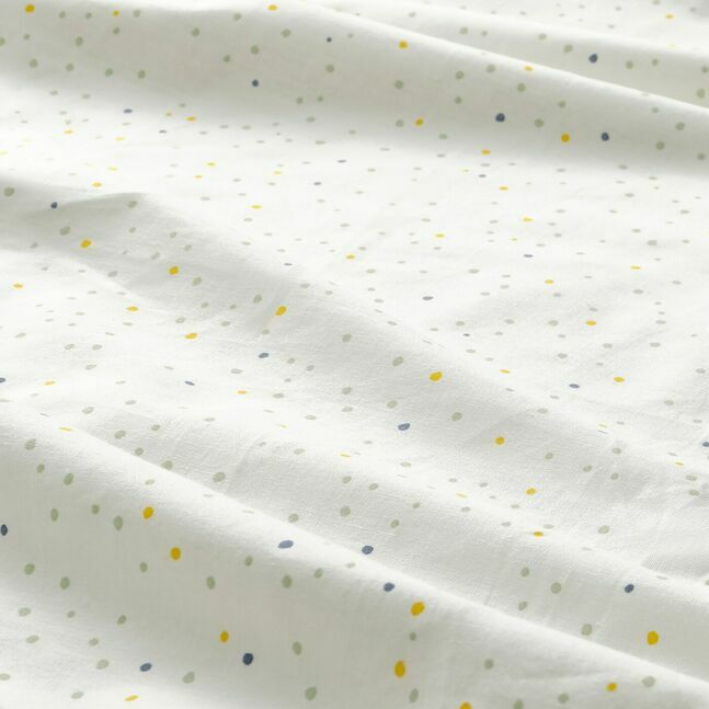 Эта приталенная простыня с точечным рисунком в цветах радуги легко сочетается с пододеяльником и другим текстилем в детской комнате. И вы, и ваш малыш будете спать спокойно благодаря мягкой ткани из 100% органического хлопка.
