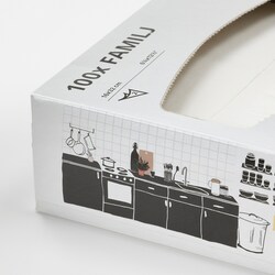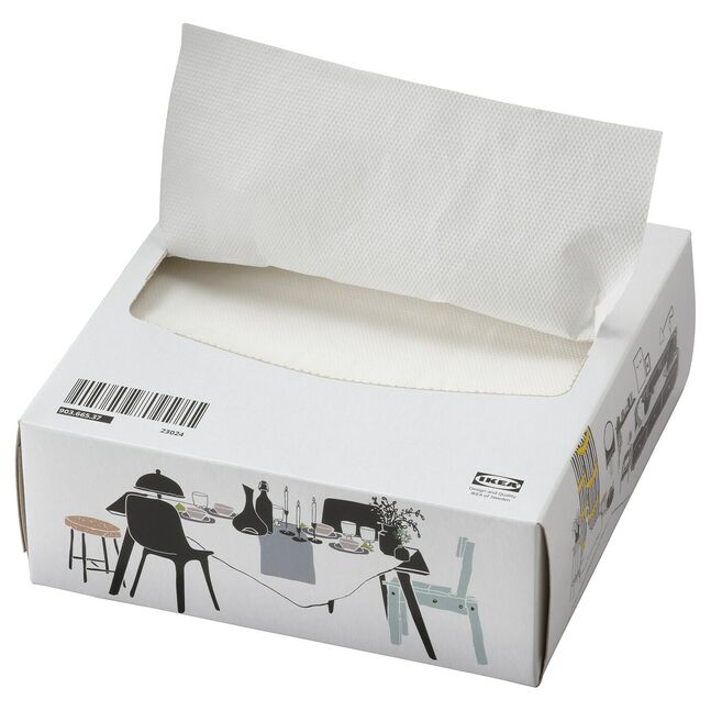 Эти салфетки поставляются в коробке, украшенной значками ИКЕА. Салфетки практичны для использования как в доме, так и в поездках на машине или пикниках.