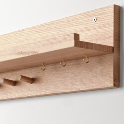 Полка имеет бортик, который предотвращает падение вещей, а под ней находятся металлические и деревянные крючки.