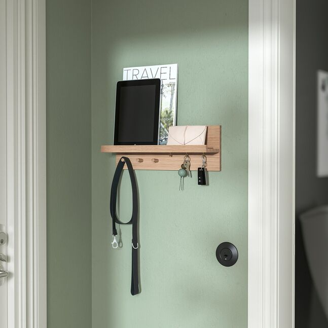 Этот настенный органайзер из массива дерева с полкой и небольшими крючками поможет вам хранить мобильный телефон, ключи и другие мелкие предметы в порядке - даже если пространство небольшое и узкое.