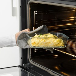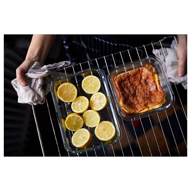 Контейнер для еды изготовлен из безопасного для духовки стекла и может использоваться как посуда для духовки/сервировки.