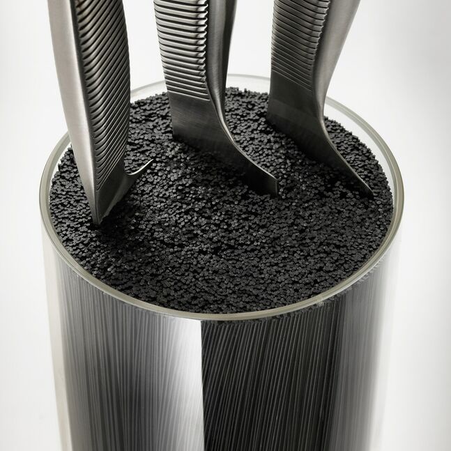 Гибкое хранение ножей, поскольку блок для ножей не имеет прорезей, а заполнен плотно уложенными пластиковыми нитями, что позволяет вставлять ножи в любое место блока.
