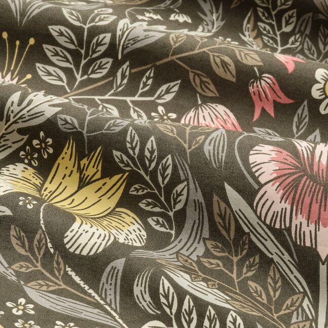 Богатый цветочный узор в земляных тонах вдохновлен проявлениями британского движения "Искусство и ремесла". Плотно сотканная перкаль из хлопка и лиоцелла с матовой поверхностью ощущается на коже прохладной и хрустящей.
