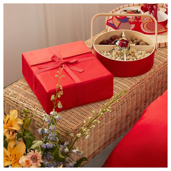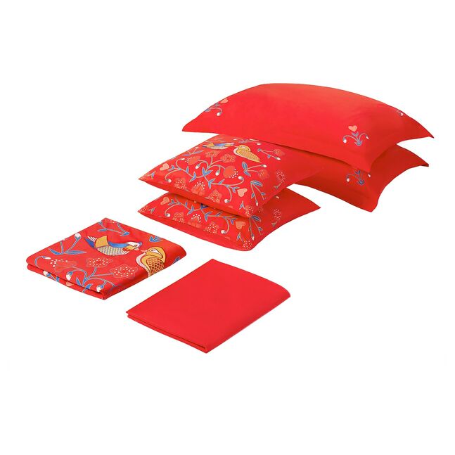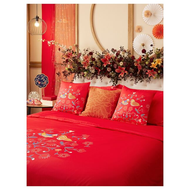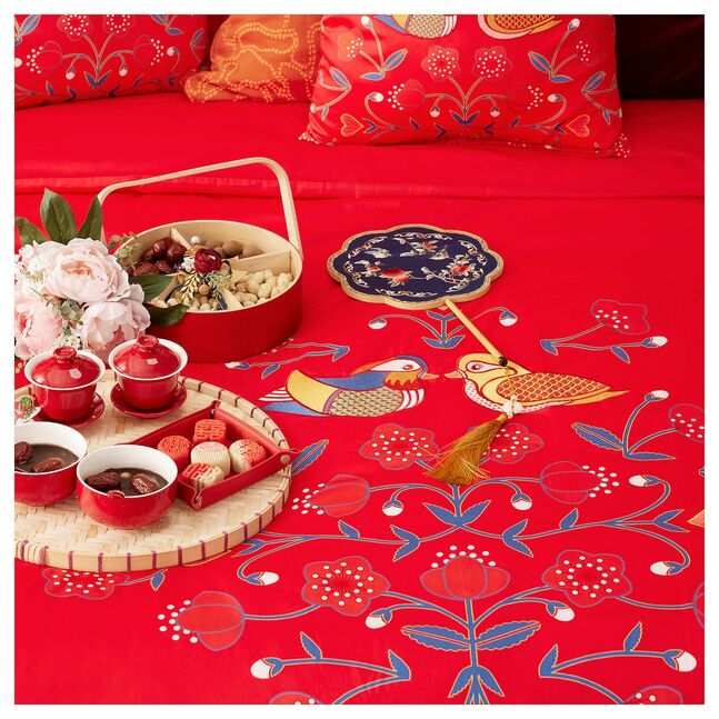 "Мне очень нравятся утки-мандаринки - символ любви на всю жизнь в Китае. Вместе с цветами персика на постельном белье KATTOSTMAL классического красного цвета они образуют красочный, вдохновленный курбитами узор, наполненный наилучшими пожеланиями для молодоженов!"