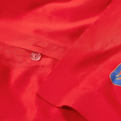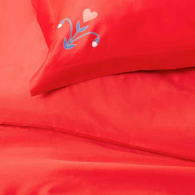 Вышитый узор в жизнерадостных тонах придает классическому красному комплекту постельного белья роскошную выразительность.