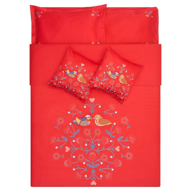 Комплект постельного белья с вышитыми сердцами и утками-мандаринами, китайским символом любви на всю жизнь, в окружении красочного узора. Идеальный подарок для молодоженов, вдохновленный картиной шведских курбитов.
