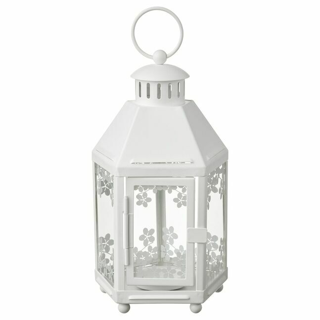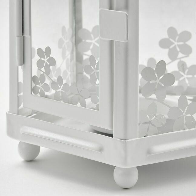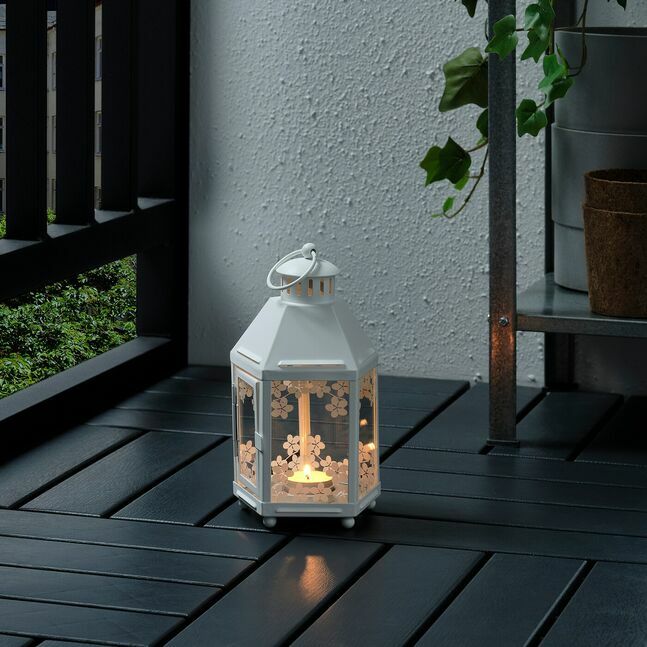 Теплый свет свечи декоративно просвечивает сквозь узор на фонаре.