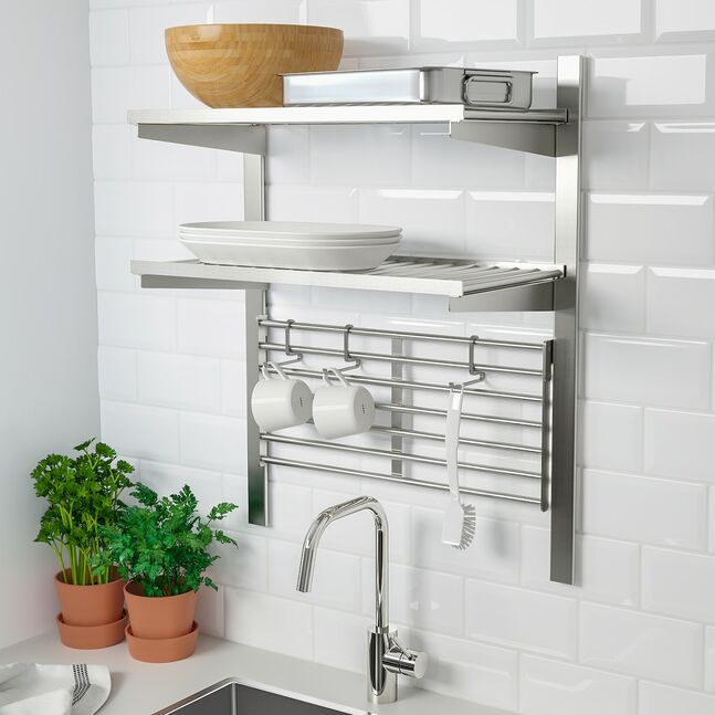 Когда ложки, специи и рецепты имеют свое определенное и заметное место на стене, вы получаете больше пространства и лучший поток при приготовлении пищи. С серией KUNGSFORS легко создать индивидуальную комбинацию и хранить все так, чтобы предметы были легко доступны, а вы получали хороший обзор на кухне, как профессиональные повара. Разместите кастрюли на открытых полках, ножи - на магнитных подставках, а посуду - на крючках. Тогда у вас все будет под рукой и много места для работы!