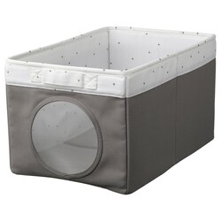 Практичная коробка с ручкой для хранения мелких предметов или одежды для малыша, содержимое которой можно увидеть через сетчатое окошко. Изготовлен из переработанного полиэстера в серых тонах, которые сочетаются с любыми цветами и стилями.