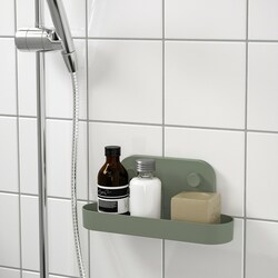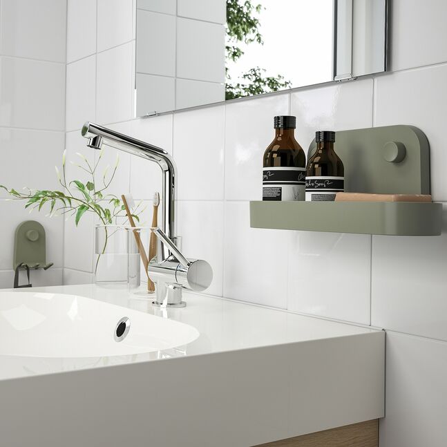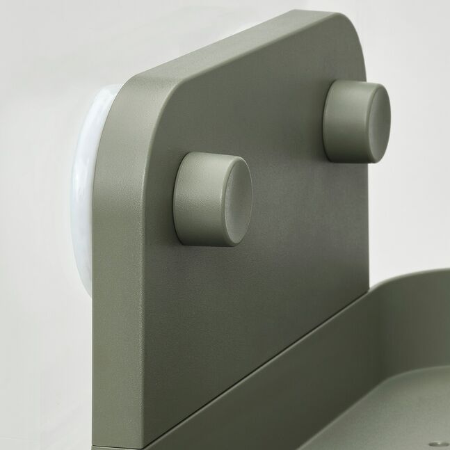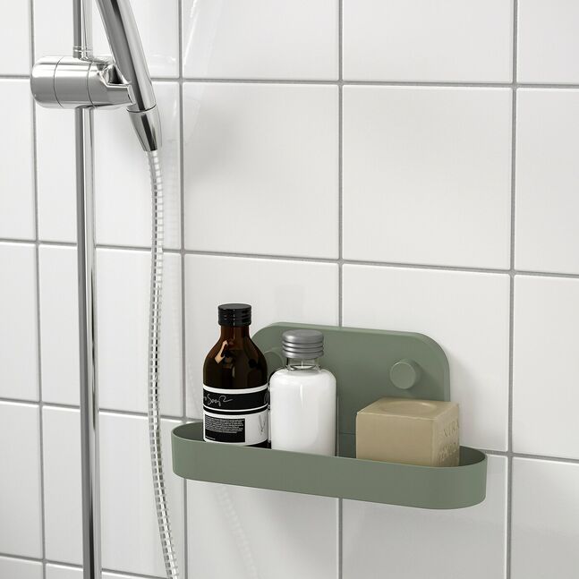 Настенные органайзеры ÖBONÄS предлагают хранение без дрели благодаря магии скрытых присосок. Простой дизайн с плавными закругленными углами и серо-зеленым оттенком создает спокойное и современное выражение.