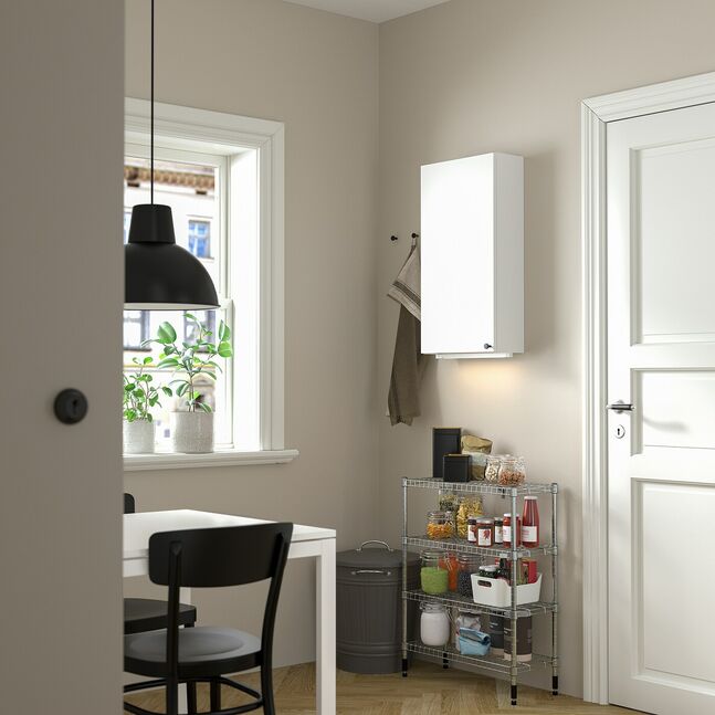 Хранилище OMAR предлагает много места на кухне, в ванной и прихожей. Такие вещи, как продукты или полотенца, лежат на металлических полках на виду и в безопасности. Легко собирается и комплектуется с системами хранения из той же серии.