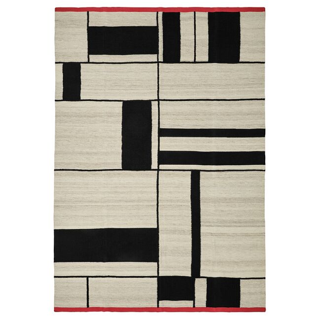 Плоскотканый ковер с графическим прямоугольным узором бежевого/черного цвета, разбросанным по мягкой шерстяной поверхности. Классический вид с красными краями, которые придают ему современную изюминку. Универсальный и готовый к размещению практически в любом месте.