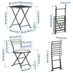 Стол (длина 55 см, ширина 54 см, высота 70 см). Стул (ширина 39 см, глубина 40 см, высота 79 см, ширина сиденья 39 см, глубина сиденья 28 см, высота сиденья 45 см).