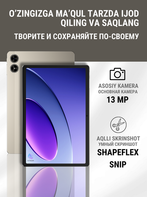 С планшетом легко запечатлеть важные моменты: 13 Мп основная камера обеспечивает высококачественные снимки с богатой детализацией, а интеллектуальная красота в фронтальной камере помогает улучшить портреты, что идеально подходит для видеозвонков.