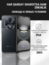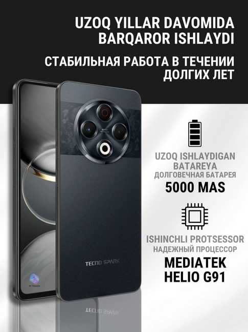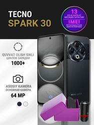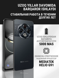 Аккумулятор на 5000 мАч с быстрой зарядкой на 18 Вт обеспечивает стабильную работу устройства в течение всего дня при активном использовании. Аккумулятор способный выдержать до 1000+ циклов зарядки, сохраняет до 80% своей изначальной ёмкости после нескольких лет эксплуатации. Это делает Spark 30 надёжным выбором для тех, кто нуждается в продолжительном времени работы без подзарядки.