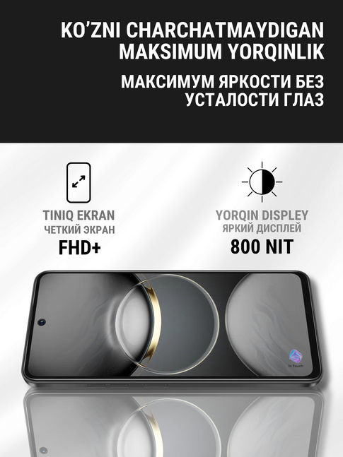 TECNO Spark 30 оснащён 6,78-дюймовым FHD+ экраном с разрешением 1080*2460 пикселей и частотой обновления 90 Гц, что дарит плавное и чёткое изображение. Яркость до 800 нит позволяет комфортно пользоваться устройством даже под прямыми солнечными лучами, а качественная цветопередача делает просмотр видео, игр и фото ещё более захватывающим.
