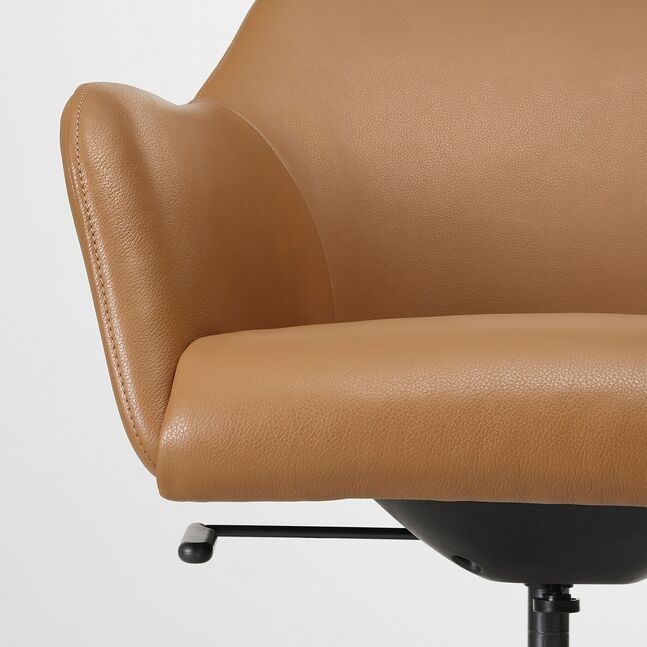 Вращающееся кресло с мягкими формами и приятной набивкой. Обивка из прочной кожи, которая хорошо сочетается с любым типом помещений, и колесики, которые позволяют легко перемещать его.
