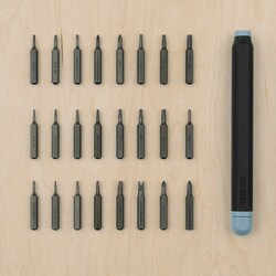 В комплект входят: 1 магнитный ящик с битами: SL1.5, SL2, PH000, PH00, PH0, H1.5, H2.0, H2.5, T3, T4, T5, T6H, T7H, T8H, T9H, Y0.6, W1.5, P2, P5, P6, TA2.3, PZ00, PZ0, U2.3 и 1 прецизионная отверточная рукоятка.
