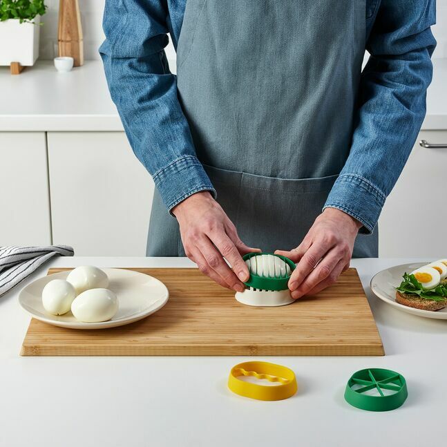 Подавайте яйца ломтиками, клиньями или волнистыми половинками с помощью ломтерезки для яиц UPPFYLLD. Ее легко брать в руки, использовать, она безопасна для посудомоечной машины, а разные цвета облегчают поиск нужной ломтерезки!