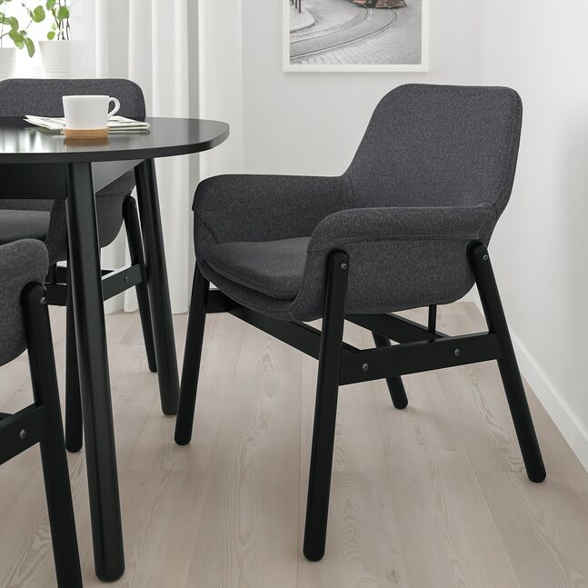Этот удобный обеденный стул с мягкой обивкой и подлокотниками не даст вам заскучать, а когда не используется, аккуратно задвигается под стол. Прекрасно сочетается со столом VEDBO, создавая неподвластный времени образ.