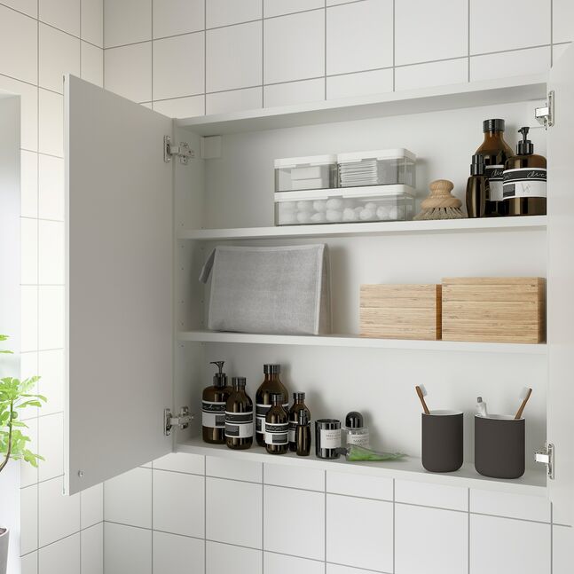 Yuvinish havzasi ustidagi oynali eshiklar ertalabki tartiblarni engillashtiradi va xonani kattaroq va yorqinroq qiladi. ENHET eshiklari va tortmasining jabhalari va uyda mavjud bo'lgan mebellar bilan mos kelish oson.