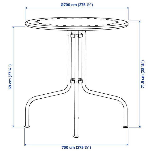 Jadval(diametri 70 sm, balandligi 71 sm). Kreslo (kengligi 42 sm, chuqurligi 52 sm, balandligi 87 sm, o'rindiq kengligi 37 sm, o'rindiq chuqurligi 33 sm, o'rindiq balandligi 44 sm).
