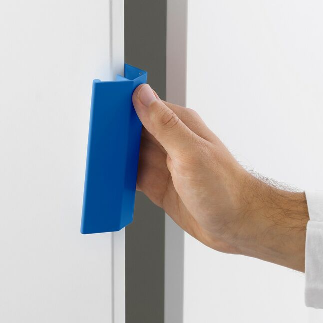 PLATSA saqlash echimiga ko'k rangdagi o'ynoqi aksent bilan bir oz rang qo'shing. Siz osonlik bilan siz tortmasi jabhada va eshiklar kuni kabi qaerda joyda L RAKKHTTHET dastakni yoruglik mumkin.